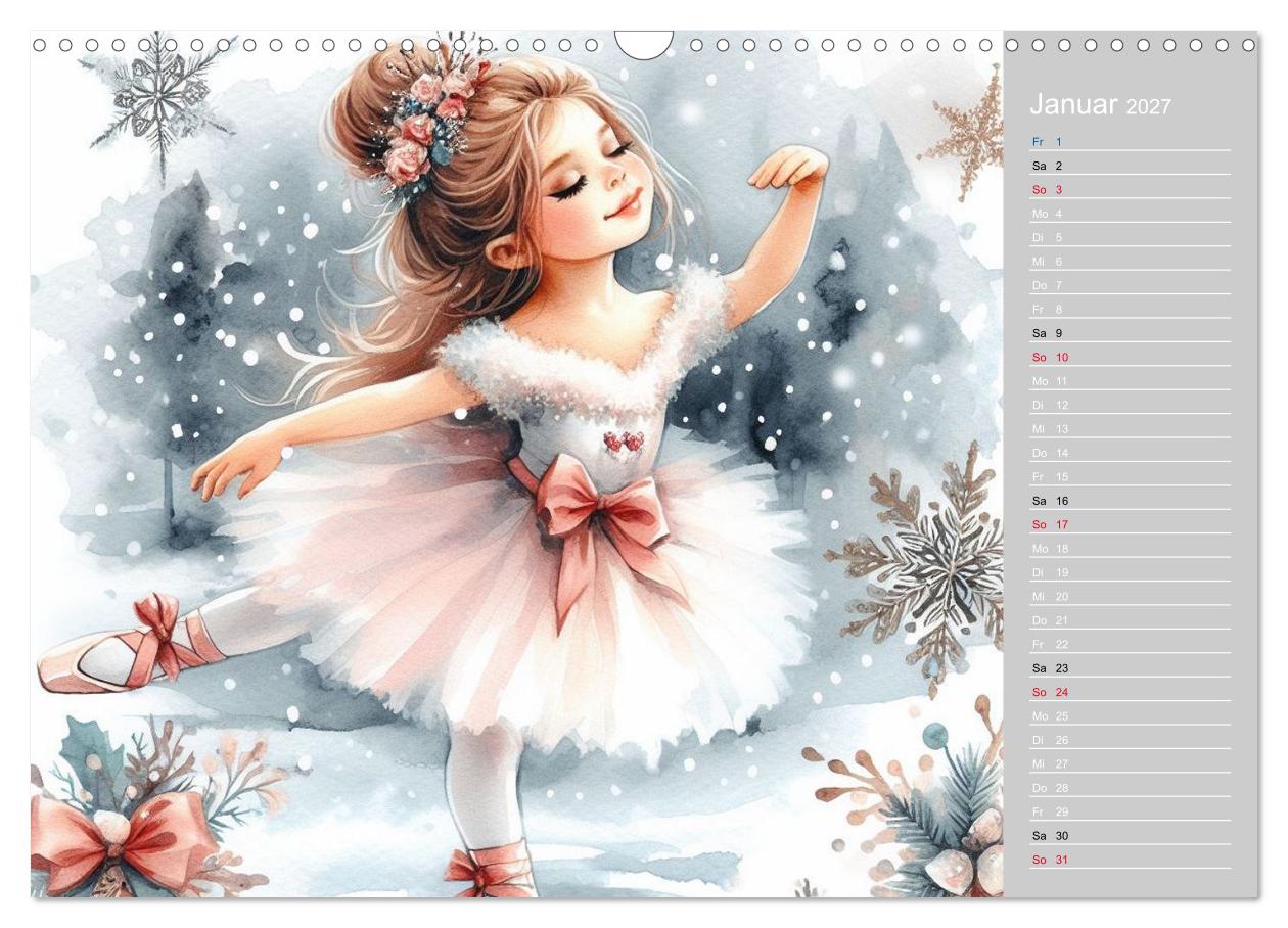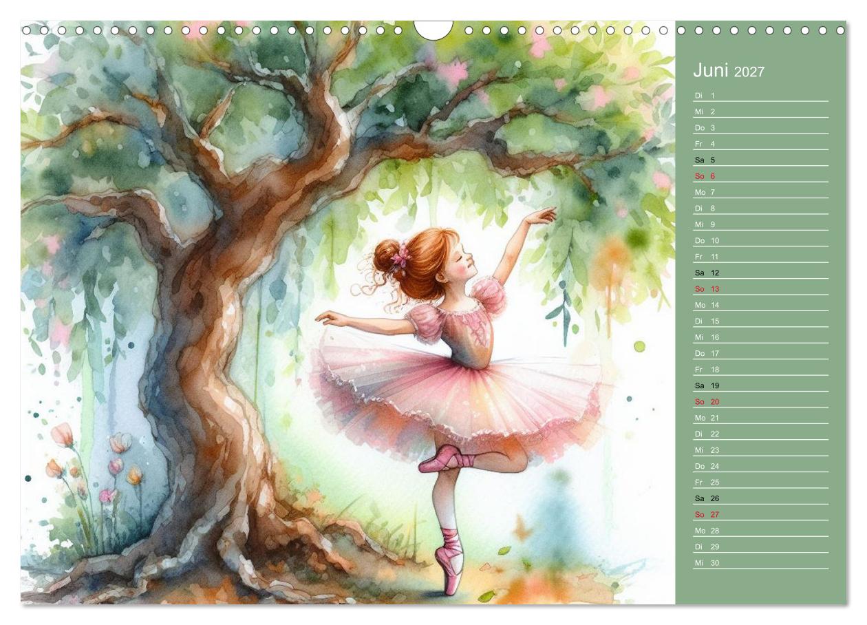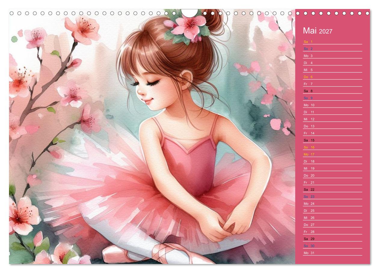 Jede Seite zeigt eine einzigartige Illustration eines tanzenden Kindes im Ballerina-Look – verspielt, zart und voller Magie. Gleichzeitig bietet der Kalender Platz, um Termine, Geburtstage, Pläne und wichtige Notizen übersichtlich einzutragen. So wird er nicht nur zu einem praktischen Terminplaner, sondern auch zu einem echten Blickfang.