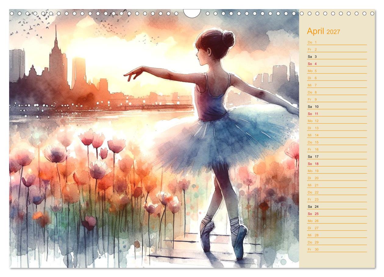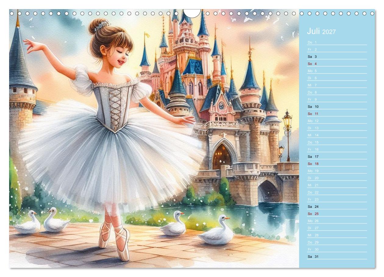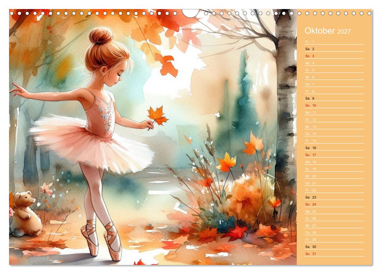 Jede Seite zeigt eine einzigartige Illustration eines tanzenden Kindes im Ballerina-Look – verspielt, zart und voller Magie. Gleichzeitig bietet der Kalender Platz, um Termine, Geburtstage, Pläne und wichtige Notizen übersichtlich einzutragen. So wird er nicht nur zu einem praktischen Terminplaner, sondern auch zu einem echten Blickfang.